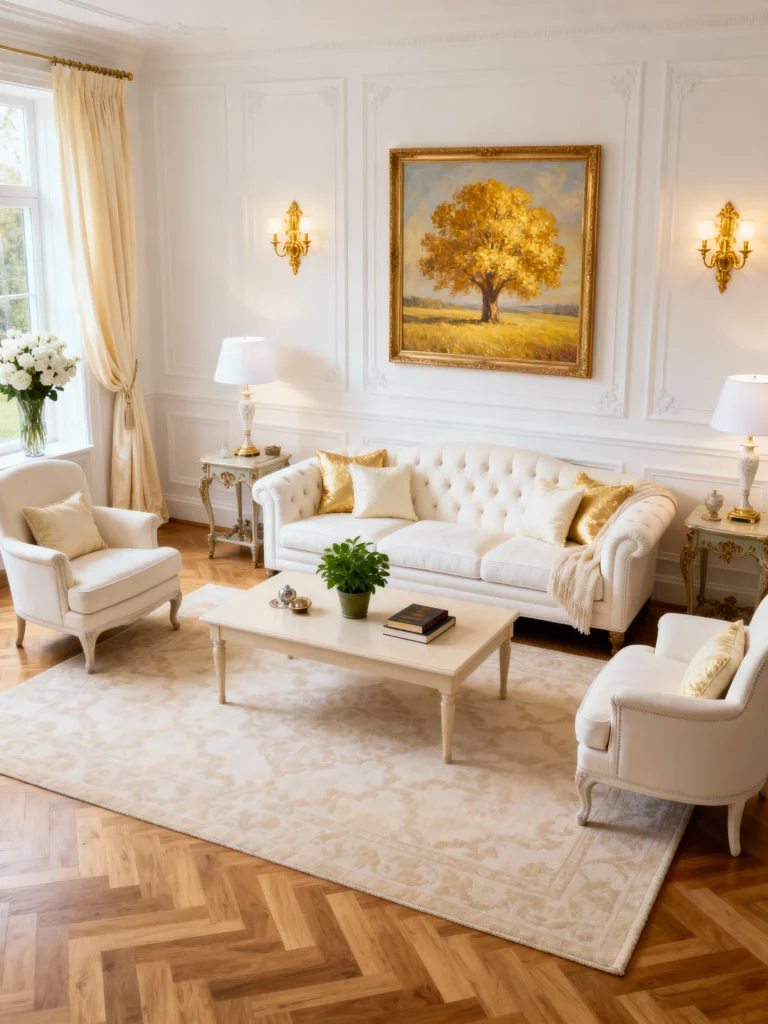 Select a cream-colored, tufted sofa with rolled arms for timeless sophistication. Place a large, gold-framed landscape painting centrally on a wall featuring classic white moldings. Keep the palette serene with a soft beige rug and polished herringbone wood floors. Add antique-style side tables and matching ceramic lamps to create perfect symmetry. Let natural light flood in through heavy, luxurious cream drapes to complete the formal look.