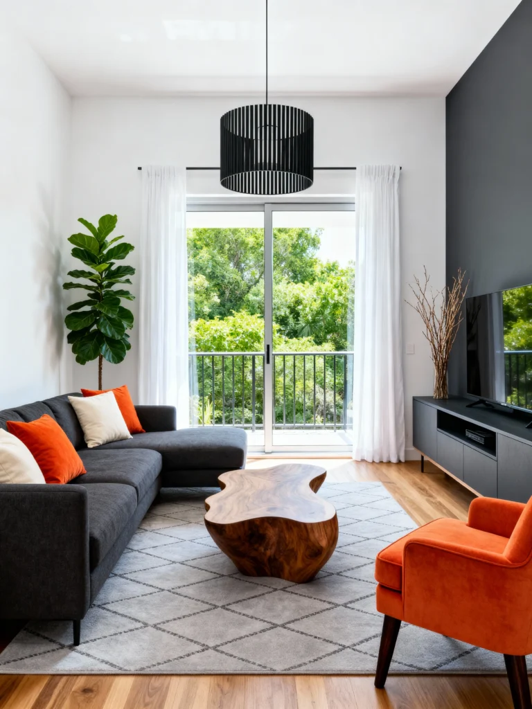 Start with a sleek, charcoal grey sectional that offers plenty of lounging space without cluttering the room. Center the space around a stunning live-edge wooden coffee table to bring a touch of nature indoors. Place a tall, leafy fiddle leaf fig in the corner for a fresh pop of green. Install a statement black drum pendant light overhead to draw the eye up. Keep your window treatments sheer.