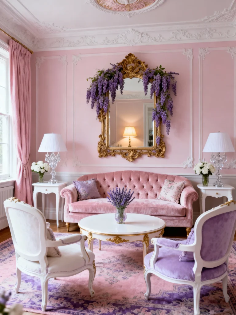 Embrace opulence with soft pink walls and elaborate white molding details. Center a plush, tufted pink velvet sofa beneath a magnificent gold mirror draped in faux wisteria. Choose white Louis XVI-style armchairs with lilac upholstery for a regal touch. Keep the coffee table ornate with gold leaf detailing and curved legs. Arrange fresh lavender and white roses to enhance the romantic, fairy-tale atmosphere.