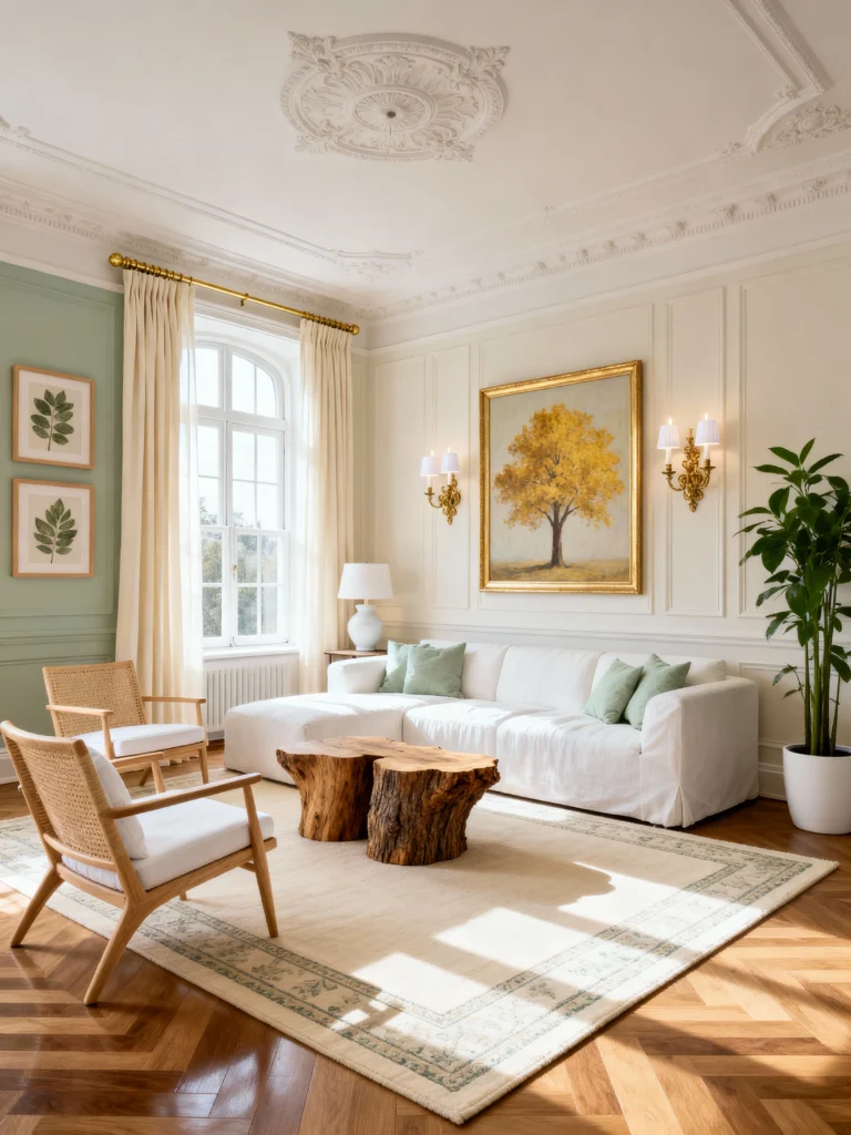 Paint your walls a deep, heritage sage green to ground the space in history. Choose a buttery cream leather sofa and pair it with a classic beige patterned wingback chair. Lay down a deep navy rug to contrast beautifully with the warm hardwood floors. Mount a heavy, gold-framed oil painting of a landscape as your focal point. Use traditional brass lamps to cast a warm, library-like glow.