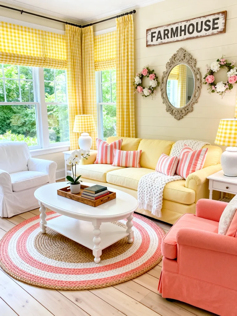 Brighten things up immediately with a sunshine yellow sofa and matching yellow gingham curtains. Hang a rustic wooden sign above the seating area for that authentic country charm. Adorn the walls with floral wreaths and a vintage-style mirror. Layer a pink and white braided rug over wide-plank floors for texture. Mix in coral-striped pillows and a white farmhouse coffee table to keep the mood playful and welcoming.