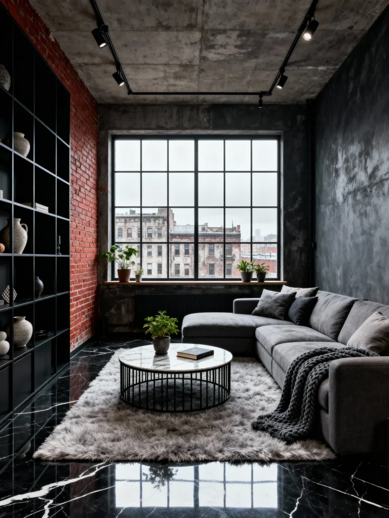 Expose that brick wall and embrace the raw concrete ceiling for a true loft vibe. Install sleek black track lighting to illuminate the space dramatically. Choose a large, dark grey sectional to match the moody atmosphere. Place a floor-to-ceiling black shelving unit on one wall to display pottery and art books. Contrast the grit with a plush grey rug and a marble-top circular coffee table.