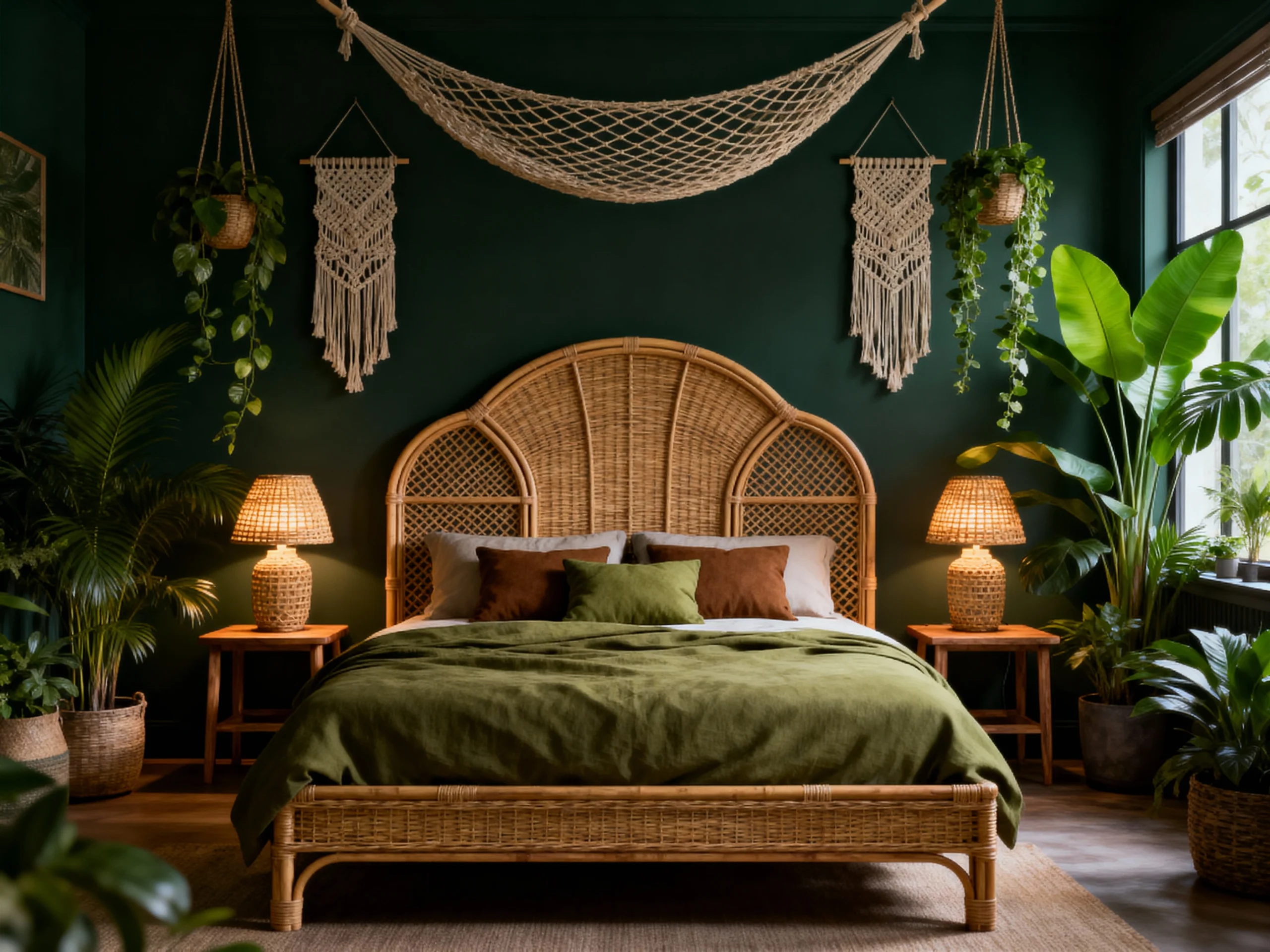 Style Notes: This room is truly an escape into a serene, almost secret garden! Paint your walls a very dark green or charcoal black to create an intimate, enveloping atmosphere. The bed features a rattan or woven headboard, and the bedding is a calming, solid dark olive green. The magic here is in the lighting: use small, glowing wicker or rattan lamps on either side to cast a warm, soft light. And of course, fill every corner with lush, dense green plants – some hanging, some large floor plants – to feel completely immersed in nature. Don’t forget a woven hammock for ultimate relaxation!