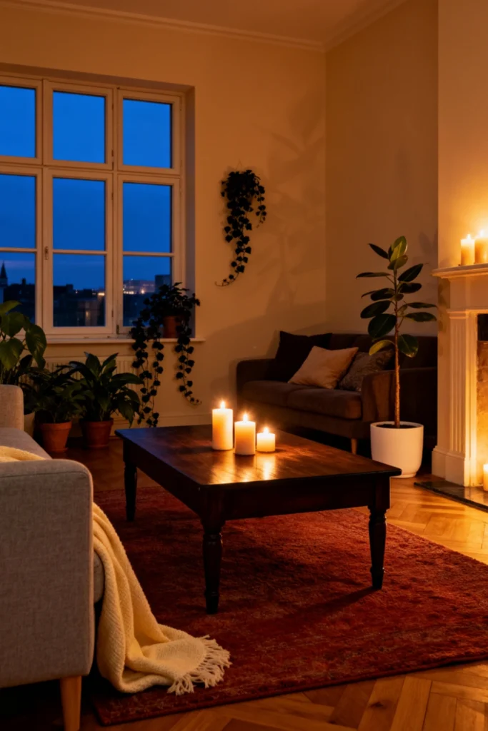 Start with a deep, plush rug in a rich burgundy or rust tone to anchor the room. Instead of harsh overhead lights, scatter thick pillar candles across your coffee table to create a flickering, natural warmth. Soften the edges of your sofa with a chunky knit throw blanket draped casually over the arm. Frame your windows with lush, trailing ivy to bring life to the corners, and let the blue twilight outside contrast with the golden heat of a crackling fireplace. It’s the ultimate setup for a quiet evening in.