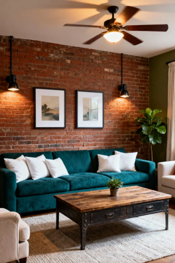 Make a statement with a deep emerald green sofa set against a rugged brick backdrop. Pop a few crisp white pillows on top to keep the look fresh and bright. Mount industrial-style black swing-arm lamps on the wall to highlight your favorite artwork and provide focused light. A reclaimed wood coffee table with metal legs adds a touch of “sturdy” charm. Finish the look with a large fiddle leaf fig in the corner to bring a burst of vibrant green that matches the velvet upholstery.