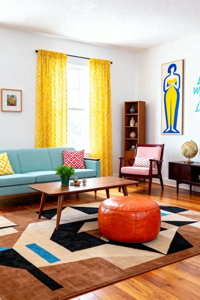 Inject some personality with a mid-century teal sofa and bright yellow lattice curtains. A geometric rug with brown, tan, and blue tones anchors the room and gives it a fun, vintage “70s” vibe. Add a leather pouf for extra seating and a wooden coffee table with tapered legs for that classic silhouette. Bold, colorful wall art and a tall, slim teak bookcase allow you to show off your unique style. It’s a cheerful, sunny space that feels warm even on the cloudiest days.