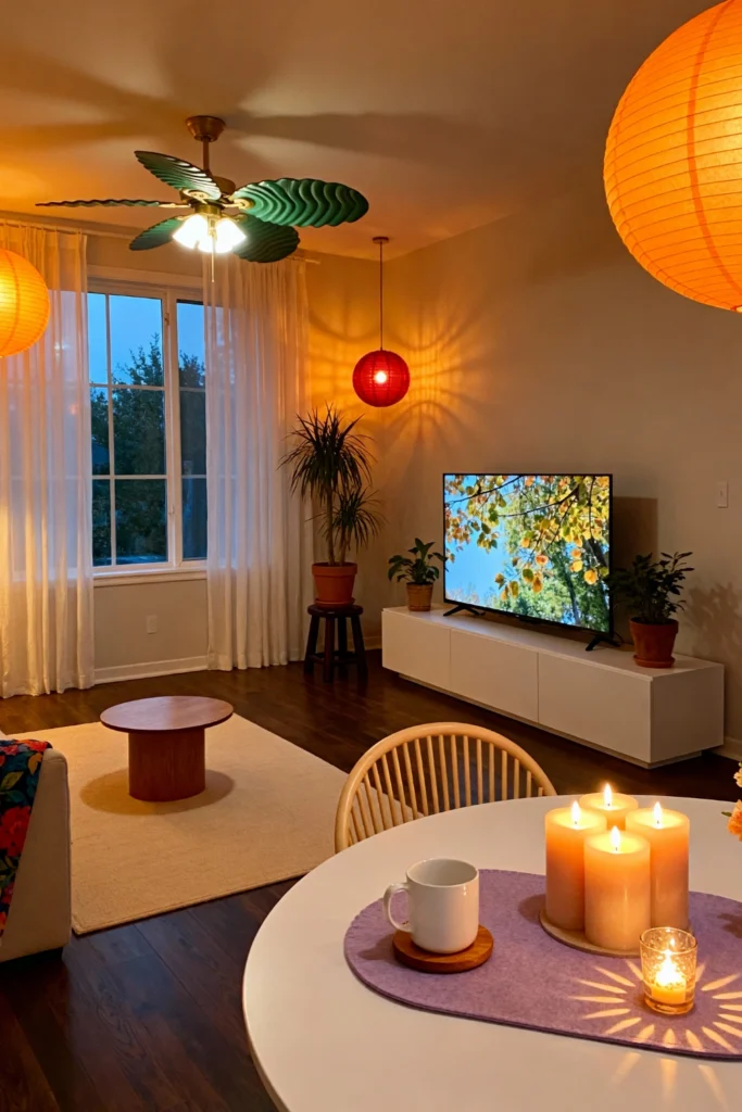 Swap out standard bulbs for oversized paper lanterns in warm oranges and reds to cast a soft, diffused glow throughout the room. Mix and match your seating—think a classic white sofa paired with a light wood spindle chair for an airy feel. On your dining or coffee table, cluster different-sized candles on a simple tray to create a focal point. Don’t forget a few potted plants on stools to add height and greenery, making the transition from your living area to the window feel seamless and natural.