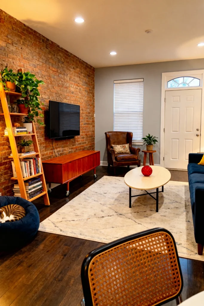 If you have an exposed brick wall, let it be the star. Lean a wooden ladder shelf against it to display your favorite books and trailing pothos plants. Choose a mid-century modern sideboard in a warm cherry wood to house your electronics. A classic leather wingback chair in the corner creates an instant reading nook—just add a small wooden pedestal table for your coffee. A large, cream-colored patterned rug will soften the dark wood floors and tie the whole “urban loft” aesthetic together perfectly.