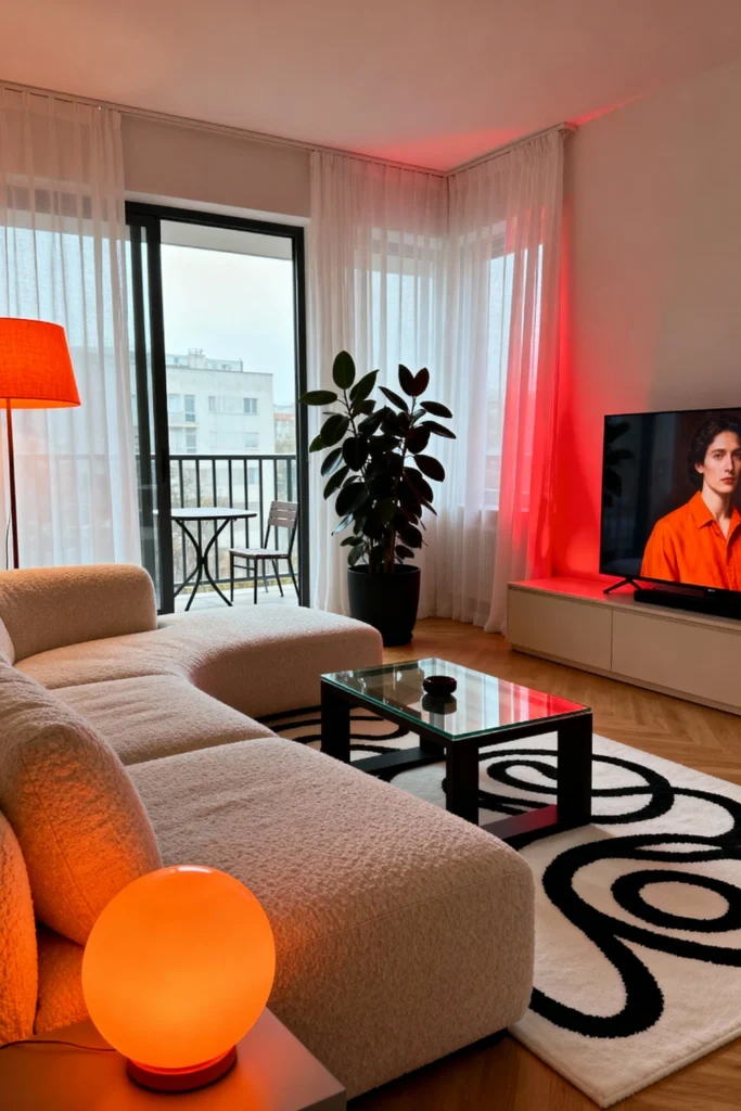Who says warm can’t be vibrant? Lean into a “vaporwave” aesthetic by adding a pink neon sign and an RGB floor mirror that washes the walls in purple and blue light. Keep the furniture neutral—like a large, light grey sectional—to let the colors do the talking. Add a glass coffee table to reflect the neon hues, and place a few LED-filled bottles on top for extra sparkle. It’s a modern, high-energy take on coziness that feels like your own private lounge for movie nights or gaming.