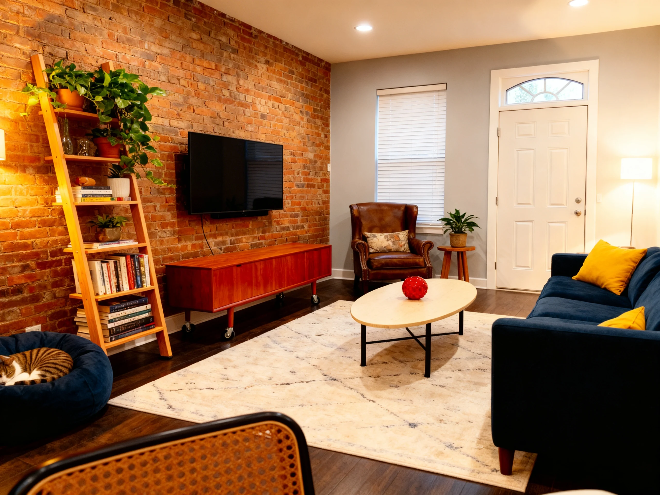 If you have an exposed brick wall, let it be the star. Lean a wooden ladder shelf against it to display your favorite books and trailing pothos plants. Choose a mid-century modern sideboard in a warm cherry wood to house your electronics. A classic leather wingback chair in the corner creates an instant reading nook—just add a small wooden pedestal table for your coffee. A large, cream-colored patterned rug will soften the dark wood floors and tie the whole “urban loft” aesthetic together perfectly.