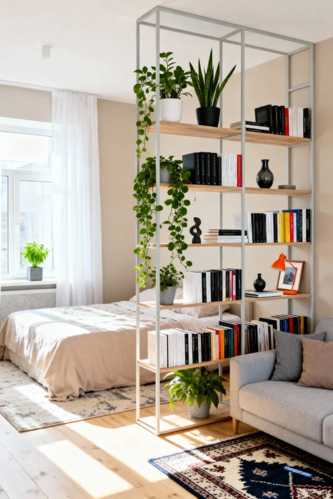 Divide your studio apartment without blocking the natural light by using a tall, open metal shelving unit. Fill the shelves with cascading greenery and neat stacks of books to create a translucent “living wall.” Keep the bedding neutral with light linen textures for a soft, uncluttered look. Place a compact grey sofa on the other side of the shelf to clearly define the living area. It’s the perfect way to separate your sleep sanctuary from your social space while keeping things bright.