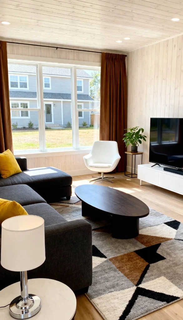 Bring the beach house vibe inside with whitewashed vertical wood paneling on the walls. Choose a dark charcoal sectional to ground the airy space and provide plenty of seating. Throw on some mustard yellow velvet pillows for a sunny pop of color that isn’t too overwhelming. Use a dark, oval wood coffee table to mimic organic shapes. Finish with a geometric rug in earth tones to add pattern without distracting from the serene view outside the large windows.