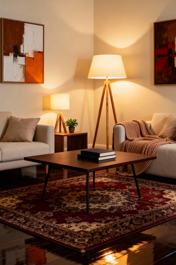 Create an intimate conversation spot by arranging two neutral beige sofas in an L-shape. Anchor the corner with a tall, wooden tripod floor lamp casting a warm, golden glow to banish any harsh shadows. Add a smaller table lamp on a side table to create layered, ambient lighting. Place a sleek, dark wood coffee table in the center to hold your evening reads and drinks. Finish the look with abstract art in warm earth tones on the walls to tie the neutral palette together perfectly.