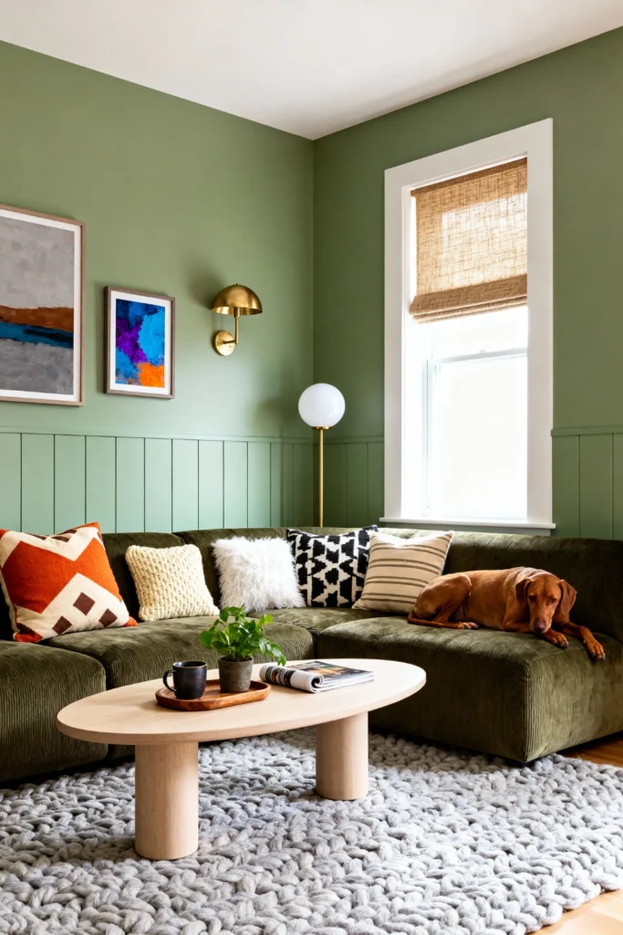Go bold with a monochromatic look by painting your walls a soothing sage green, pairing them with matching wainscoting for architectural depth. Choose a deep green corduroy sectional to anchor the room; it adds incredible texture and invites you to sink right in. Ground the space with a chunky, grey knit rug that feels just like a cozy sweater for your floor. Add a light oak oval coffee table to break up the color palette naturally. Finally, mount a brass sconce on the wall for a touch of warm shine against the matte paint.