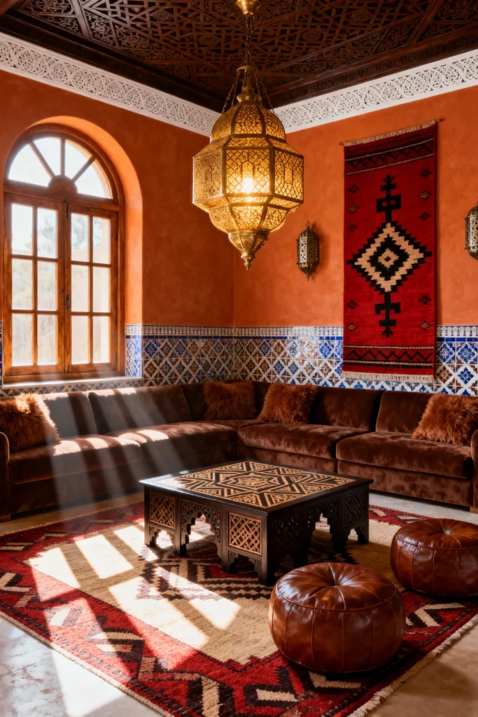 Embrace rich culture by painting your walls a warm, textured terracotta orange. Install a stunning, intricate brass lantern as the room’s crown jewel to cast mesmerizing shadows. Arrange low, velvet brown seating around the perimeter of the room to encourage communal gathering. Use a geometric, inlaid wooden table as the focal point, surrounded by round leather poufs for flexible seating. Don’t forget the details—hang a bold tribal rug on the wall as a tapestry and admire the intricate geometric woodwork on the ceiling.