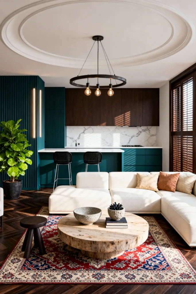 Make a sophisticated statement with a deep teal, fluted accent wall that contrasts beautifully with a dark walnut kitchen in the background. Opt for a low-profile, cream sectional to keep the visual flow of the room open and airy. Center the living area with a large, rustic round wood table sitting atop a classic patterned rug. Look up and install a black industrial ring chandelier with exposed bulbs to highlight the circular ceiling details. It’s all about mixing sleek modern lines with raw, natural textures.