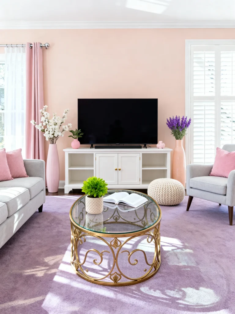 Don’t be afraid of color; paint your walls a soft blush pink to set a cheerful tone. Match it with a plush lilac carpet for a dreamy, colorful foundation. Select light grey armchairs to balance the sweetness with a neutral touch. Use a gold and glass oval coffee table to add a bit of glamour and shine without adding visual weight. Accessorize with tall pink vases and purple flowers to keep the theme cohesive. It’s fresh, feminine, and totally inviting.