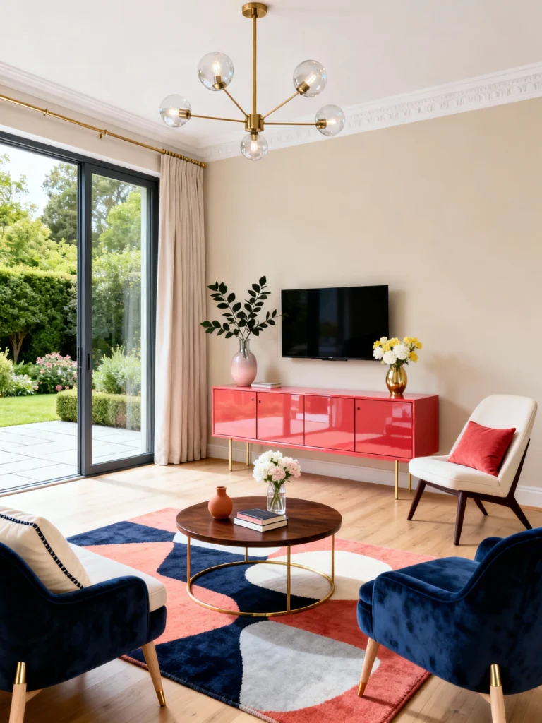 Inject serious energy into a neutral room with a high-gloss, bright red sideboard. Contrast this with a navy blue velvet armchair for a bold, mid-century color block effect. Keep the walls a creamy beige to let the furniture pieces really stand out. Lay down a graphic rug with sweeping blue and red curves to tie the colors together on the floor. Add a modern brass chandelier with globe lights overhead to complete this cheerful, artful look that connects the indoors to the garden view.