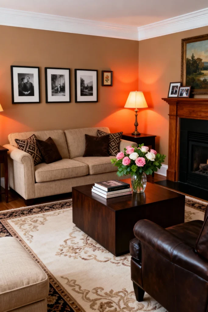 Center your room around a classic fireplace with a rich wood mantel to create a natural focal point. Choose a structured beige sofa and pair it with a dark leather armchair for a sophisticated mix of materials. Illuminate the space with table lamps featuring warm, tapered shades to create a soft, inviting atmosphere. Decorate the walls with a symmetrical gallery of framed black and white family photos. Add a bouquet of fresh pink and white roses on a solid wood coffee table for a pop of life.