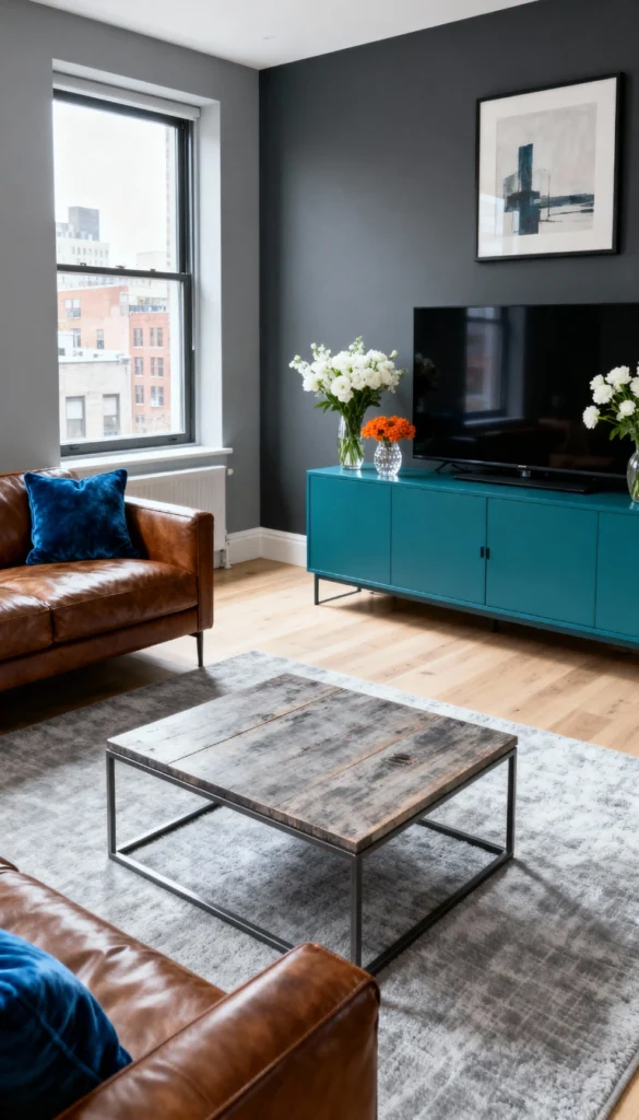 Create drama in your city apartment by painting one accent wall a dark, moody grey. Contrast the darkness with a vibrant turquoise media console that pops immediately against the matte wall. Warm things up with a cognac leather sofa that looks better with age and wear. Center the space with a rugged, industrial wood and metal coffee table. Keep your rug neutral and textured to let the bold furniture pieces do all the talking in this sleek, metropolitan living space.