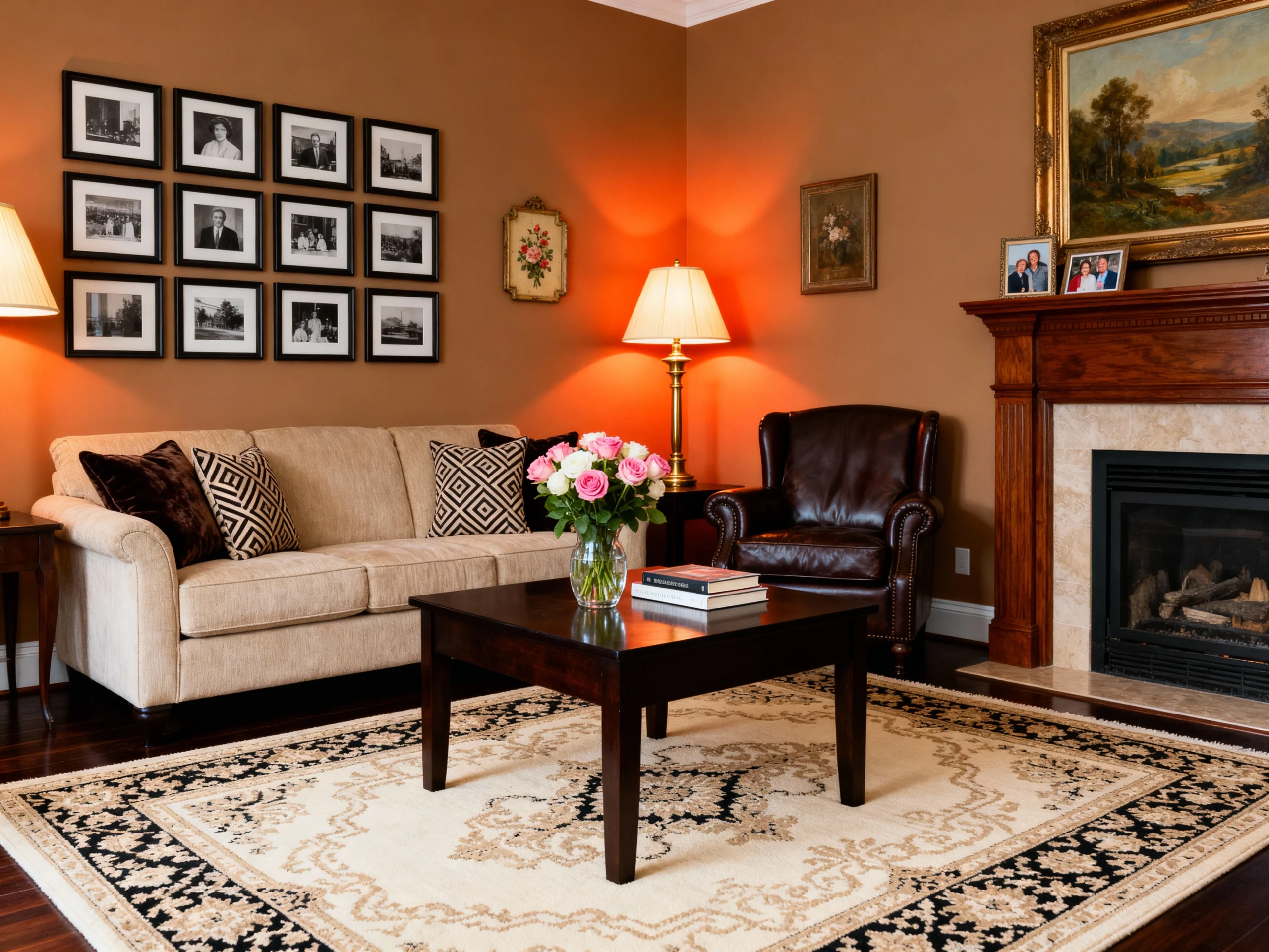 Center your room around a classic fireplace with a rich wood mantel to create a natural focal point. Choose a structured beige sofa and pair it with a dark leather armchair for a sophisticated mix of materials. Illuminate the space with table lamps featuring warm, tapered shades to create a soft, inviting atmosphere. Decorate the walls with a symmetrical gallery of framed black and white family photos. Add a bouquet of fresh pink and white roses on a solid wood coffee table for a pop of life.