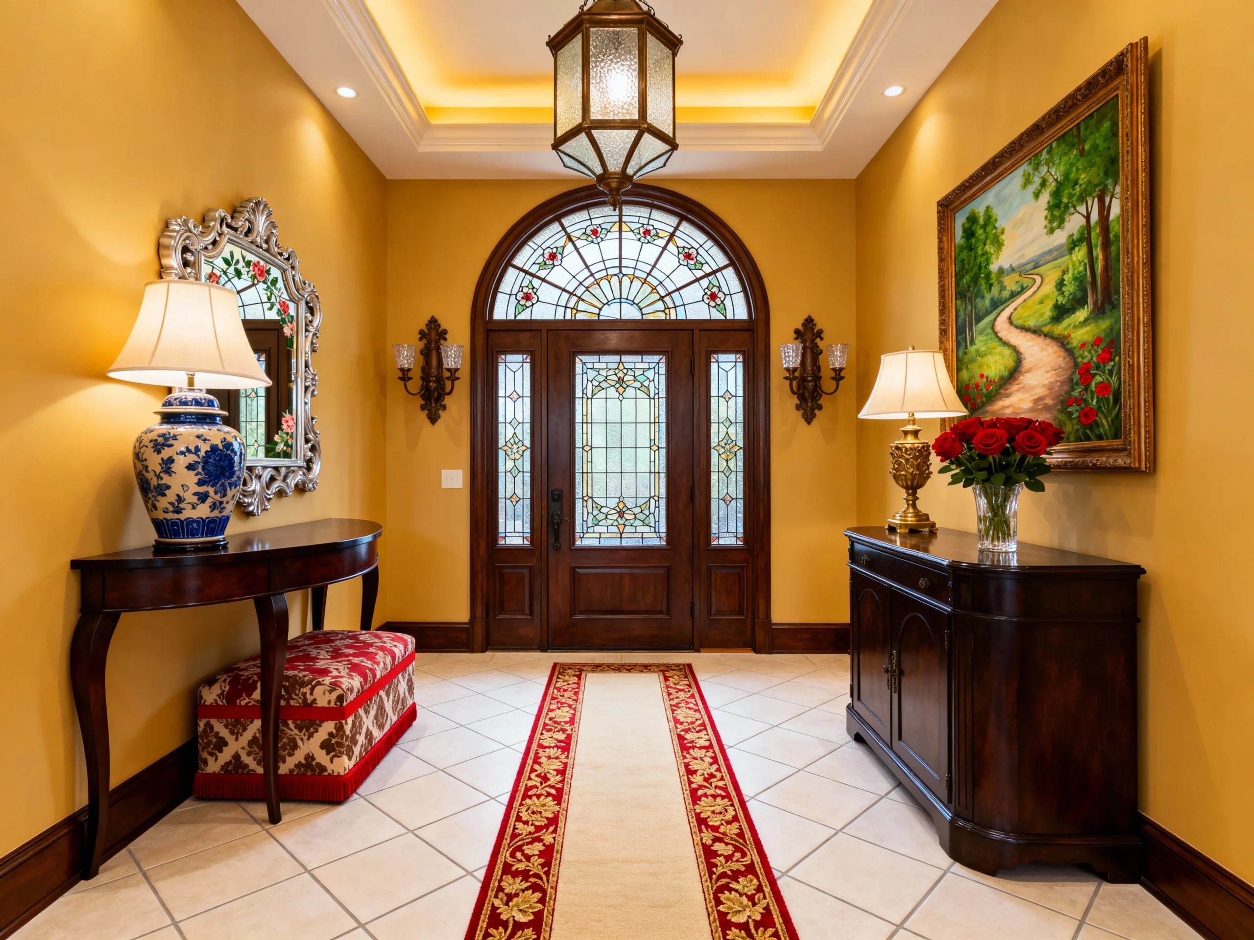 Install towering double doors featuring intricate stained glass to instantly elevate the grandeur. Paint the walls a warm, buttery yellow to reflect the light. Center a heavy, iron lantern pendant above to anchor the space. Lay down a long, red-bordered runner rug to guide guests forward. Place a dark wood console table on the side, topped with a classic blue-and-white porcelain vase lamp. Keep the symmetry perfect for a look that feels timeless and sophisticated.