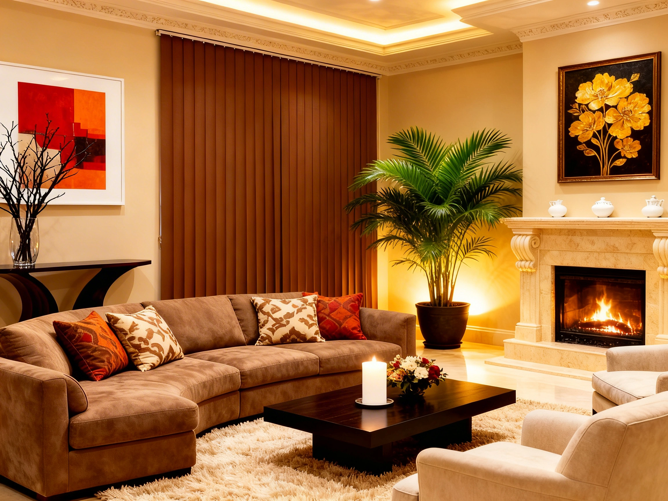 Choose a large, curved brown velvet sofa to create an intimate and conversational seating area. Frame your windows with deep brown vertical blinds to add height and a touch of retro sophistication. Hang a striking black and gold floral painting above an ornate, cream-colored stone fireplace. Place a low, dark wood coffee table right in the middle, perfect for a cozy pillar candle setup. Add a large, leafy green floor plant in the corner to breathe fresh life into the warm, monochromatic palette.