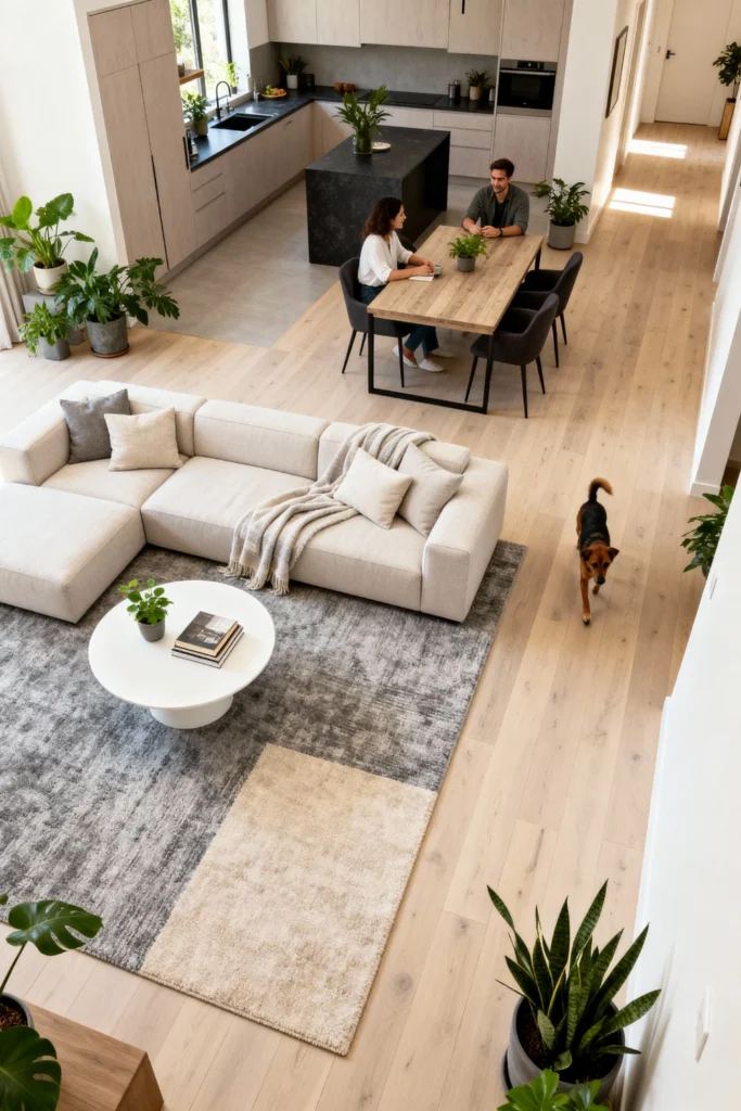 Set up a massive cream sectional to anchor your open-plan space. Throw down a large, textured gray and beige rug to define the lounge area. Place a sleek, round white coffee table right in the center—perfect for a stack of your favorite books. Scatter a few potted plants around the room to bring life and freshness indoors. Opt for light wood flooring to keep the vibe breezy and seamlessly connect your living and dining areas.