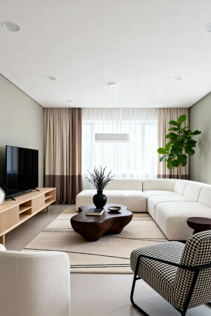 Opt for a heavily textured, cream-colored curved sectional to create a soft, inviting flow. Place a stunning, organic-shaped dark wood coffee table in the center to ground the airy room. Choose two-toned, neutral drapes that gently pool on the floor to frame the bright windows. Add a stylish houndstooth accent chair for a subtle pop of pattern. Keep the decor incredibly minimal with just a simple black vase and branches to channel serious zen vibes.