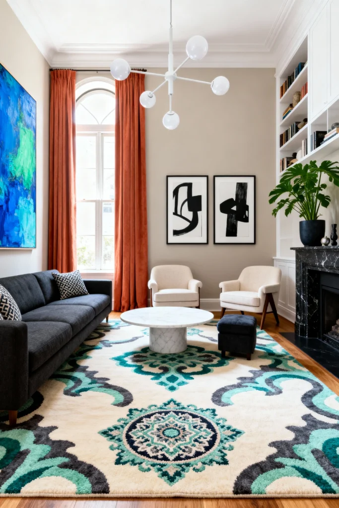 Hang dramatic, rust-orange curtains high up to frame those tall, gorgeous windows. Anchor the room with a deep charcoal sofa and flank it with two chic cream chairs. Roll out a statement rug with a bold teal and gray medallion pattern. Mount a massive, vibrant blue abstract painting to instantly draw the eye. Use a round marble coffee table to add a touch of luxury, and style your built-in shelves with books and greenery.