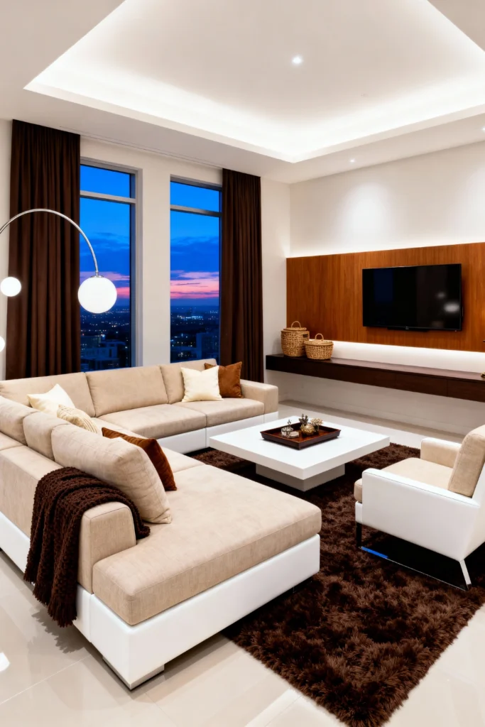 Sink into a sprawling, plush beige sectional that invites everyone to relax. Layer a deep chocolate brown, ultra-shaggy rug underneath for incredible texture. Install a sleek wood-paneled accent wall behind your TV to instantly warm up the modern space. Place a low-profile white square coffee table in the center for a crisp contrast. Keep the lighting soft and low with a sweeping arc floor lamp to perfectly complement those stunning sunset views outside your window.