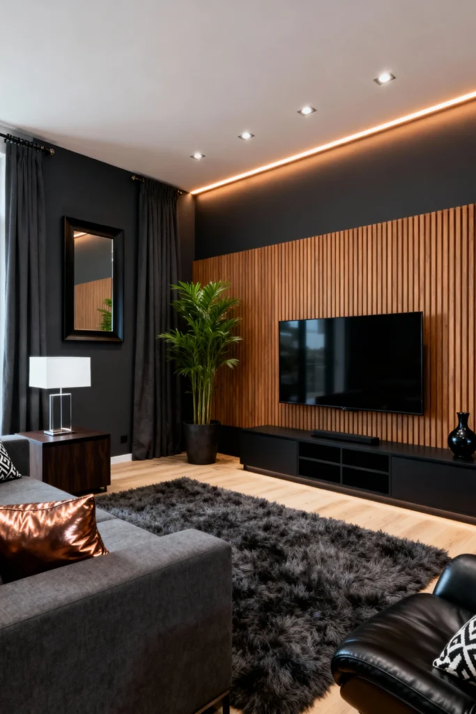 Paint your walls a deep, moody charcoal to create an instantly cozy, cocoon-like feel. Add a slatted wood accent wall behind your TV to bring in natural warmth and texture. Throw down a thick, plush dark gray rug that feels amazing underfoot. Choose a clean-lined gray sofa and add a metallic copper pillow for a surprising pop of glamour. Install warm LED strip lighting right near the ceiling to cast a soft, ambient glow over the room.