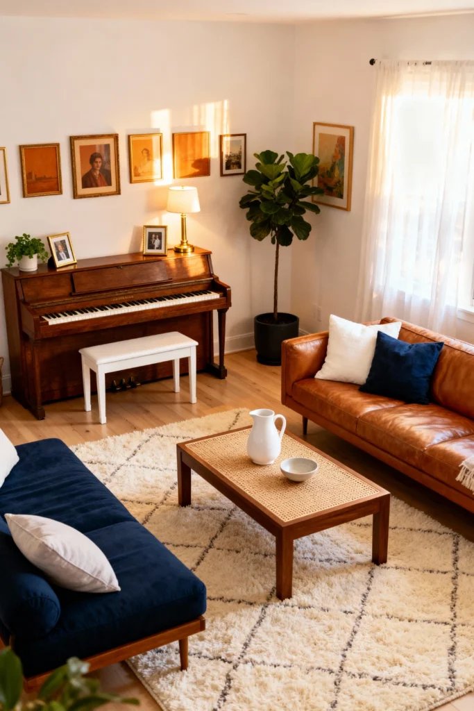 Choose a classic leather sofa in a warm, cognac tone. Place a beautiful vintage upright piano against the wall to anchor the room with character. Opt for a low, cane-topped coffee table—perfect for a simple ceramic pitcher. Roll out a fluffy cream rug with a subtle diamond pattern to tie the space together. Hang a curated gallery wall of classic portraits and landscapes in gold frames to cast a soft, inviting, and nostalgic vibe.