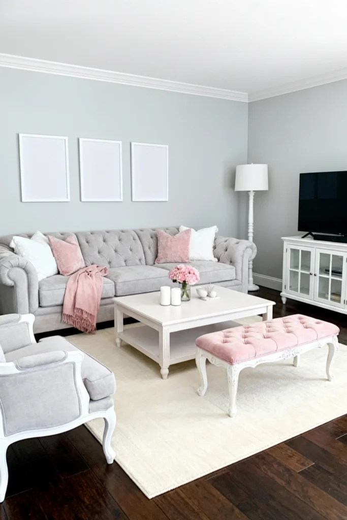 Bring in a gorgeous, light gray tufted sofa for a touch of classic elegance. Toss on a few blush pink velvet pillows and a matching throw blanket to soften the look. Place a crisp white, two-tiered coffee table in the center to keep things bright. Add a dainty pink tufted bench off to the side for charming extra seating. Hang three oversized, blank white frames above the sofa for a minimalist, airy gallery wall.