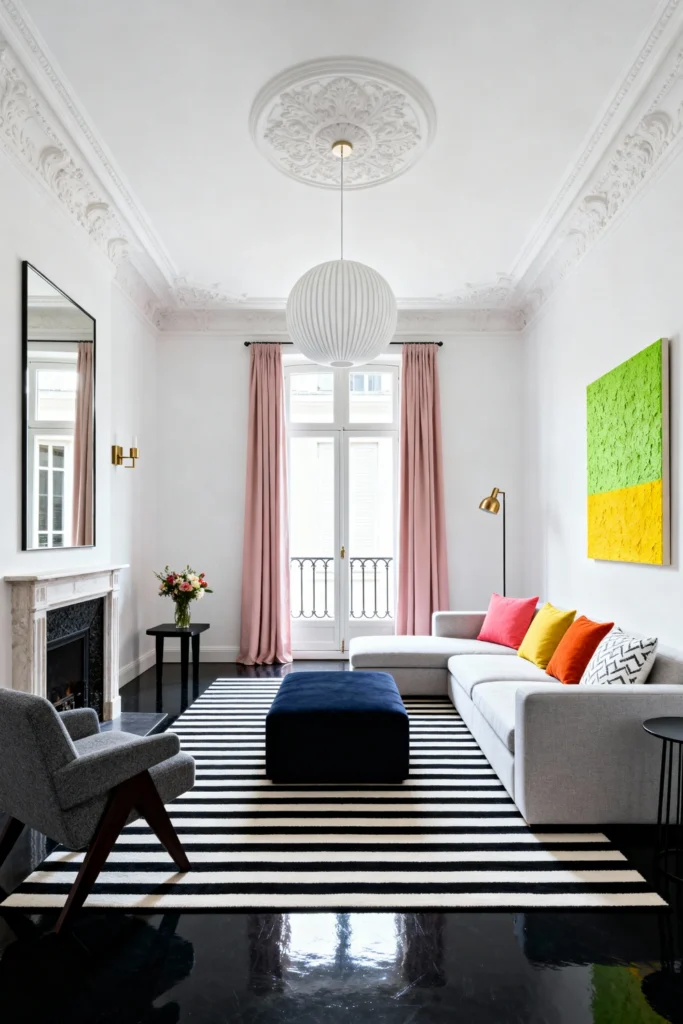 Start with an all-white backdrop and stunning ornate ceiling molding. Roll out a bold black and white striped rug to make a massive visual statement. Choose a simple, light gray sectional to let your accessories do the talking. Toss on the brightest pink, yellow, and orange pillows you can find. Hang a vibrant neon green and yellow textured canvas on the wall, and frame the windows with soft blush pink curtains for a playful twist.