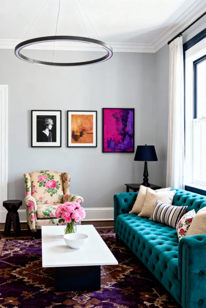 Go bold with a stunning deep teal tufted velvet sofa. Pair it with an unexpected, vintage-inspired floral armchair for serious eclectic charm. Roll out an overdyed dark purple patterned rug to ground the space in rich color. Hang a collection of striking art, including a bold magenta abstract piece, to create a moody gallery wall. Keep the coffee table sleek and white to offer a modern visual break from all the intense, beautiful colors.