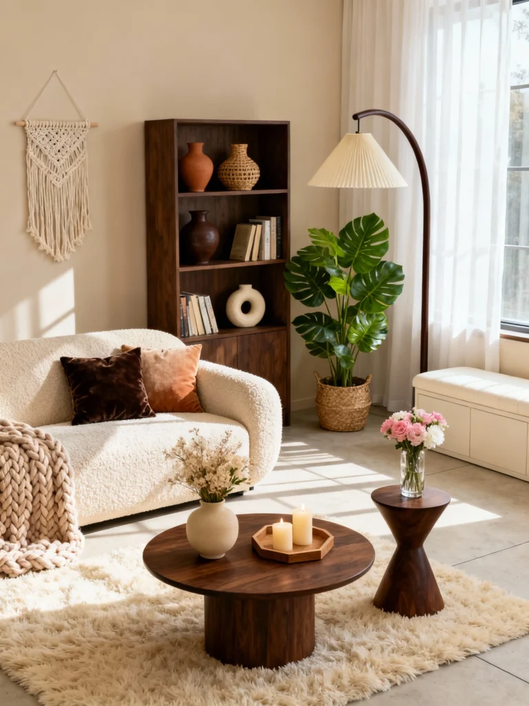 Earthy Calm Hang a large, textured macramé wall hanging to soften the acoustics and add visual interest. Place a tall wooden bookshelf filled with ceramics and earth-toned vases against a neutral wall. Choose a bouclé or textured cream sofa for a tactile experience. Position a large monstera plant in a woven basket to bring a burst of life into the corner. Opt for a pleated floor lamp and a sculptural wooden side table to keep the vibe organic, grounded, and incredibly soothing.