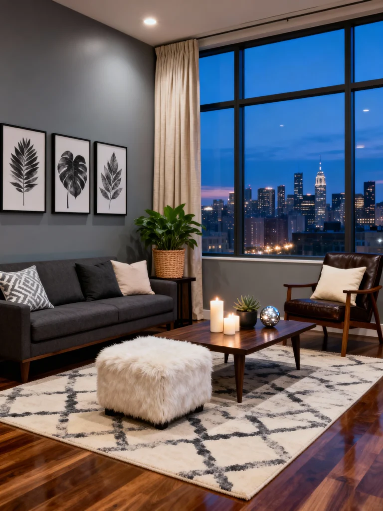 Skyline View Let the floor-to-ceiling windows do the talking by keeping window treatments minimal. Choose a sleek, charcoal grey mid-century sofa that complements the cool tones of the evening sky. Place a geometric, trellis-patterned rug to define the lounge area. Add a leather accent chair for a touch of masculine sophistication. Group pillar candles on a low, wooden coffee table to create a warm, flickering contrast against the blue city lights outside.