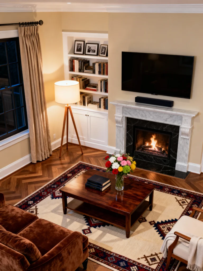 Traditional Warmth Center your furniture layout around a classic marble fireplace with a roaring fire. Fill built-in alcove shelving with a library of hardcover books to add character and warmth. Choose a wooden tripod floor lamp to illuminate a cozy reading corner. Place a polished, dark wood coffee table on top of a patterned traditional rug. Add a large bouquet of colorful flowers to brighten the beige walls and bring a fresh, inviting energy to the formal space.