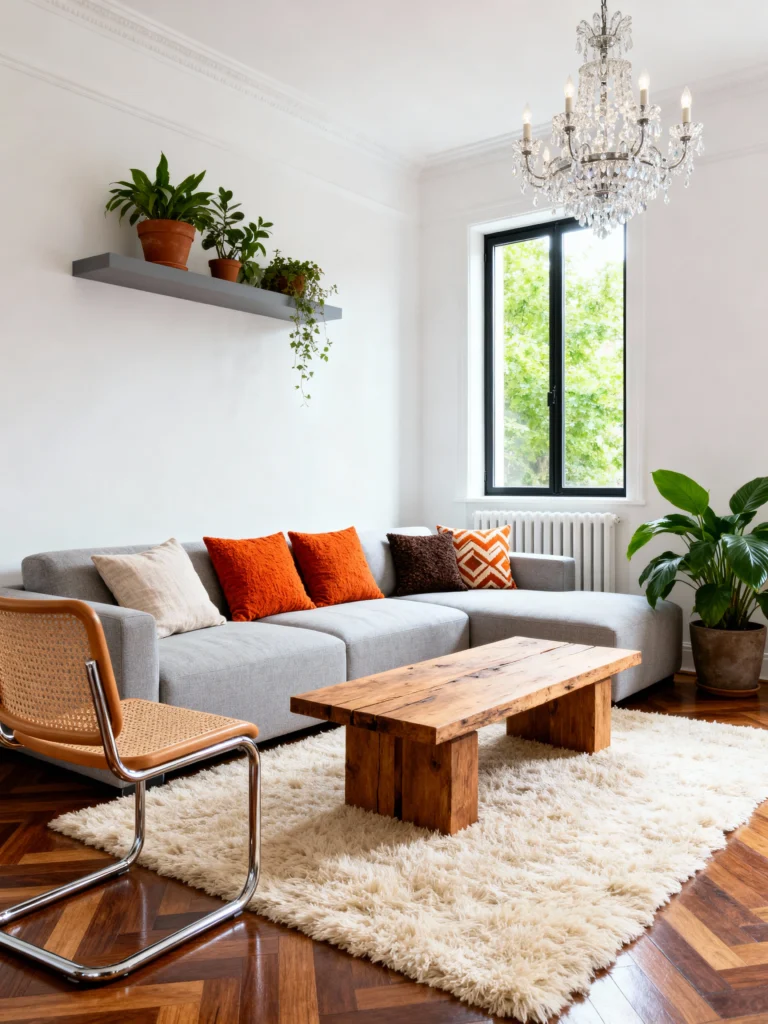 Vintage Mix Install a crystal chandelier to bring a touch of old-world glamour to the room. Mount a high, grey floating shelf to display a collection of trailing plants and terracotta pots. Choose a grey L-shaped sofa and liven it up with rusty orange and geometric patterned pillows. Place a raw, blocky wooden coffee table in the center to contrast with the elegant herringbone wood floors. Add a retro cane chair for a mid-century modern twist on this eclectic look.