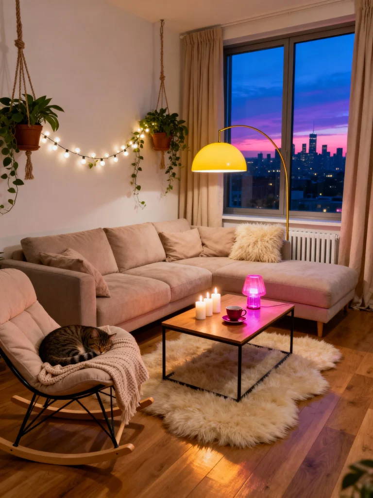 Urban Cozy Use string lights draped along the wall to create an immediate, magical ambiance. Choose a large, plush beige sectional that maximizes seating for movie nights. Place a low, industrial-style coffee table in the center to hold your evening tea and candles. Add a retro-style rocking chair in the corner—it’s the perfect spot for a cat nap or a reading session. Opt for a vibrant accent lamp, like a purple glass piece, to add a splash of playful color against the city twilight.