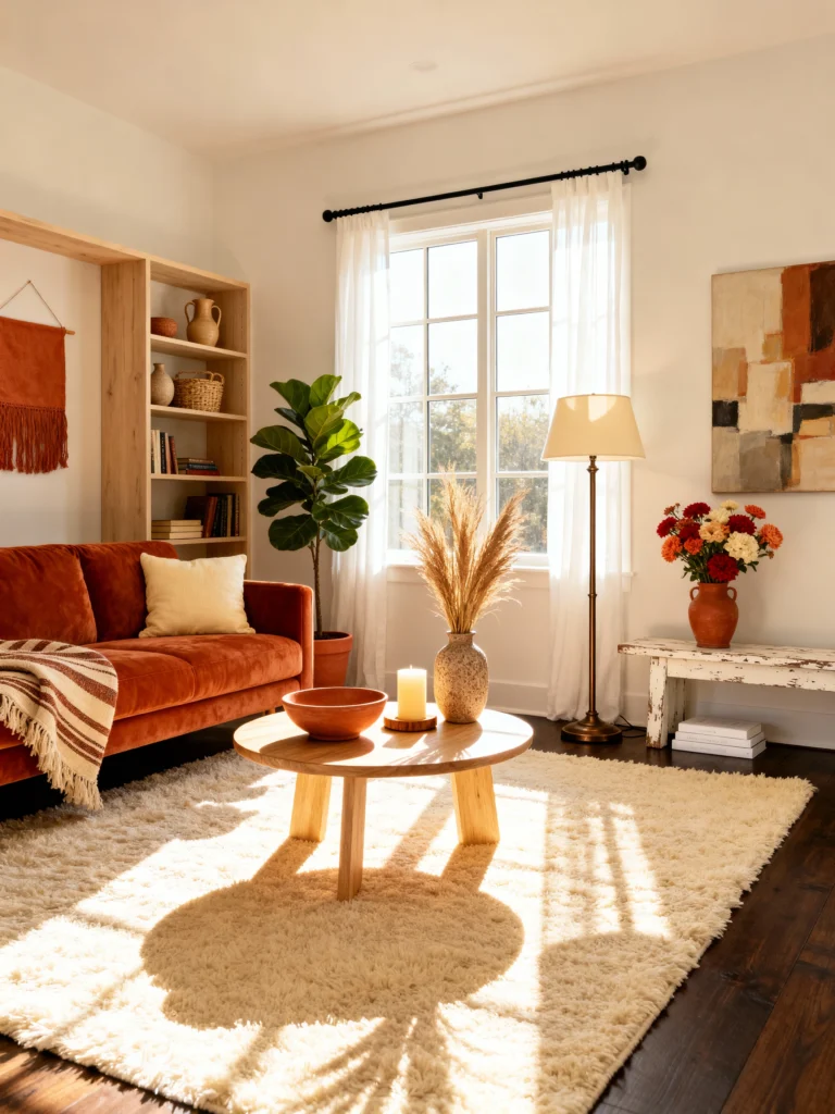 Sun Drenched Choose a burnt orange velvet sofa to serve as the room’s warm, inviting centerpiece. Place a tall fiddle leaf fig tree near the window to filter the sunlight. Lay down a high-pile cream rug to catch the shadows and add softness underfoot. Style a round, light-wood coffee table with a textured vase and dried wheat stalks. Keep the window treatments sheer to let that beautiful golden hour light flood the space and highlight the wood tones.