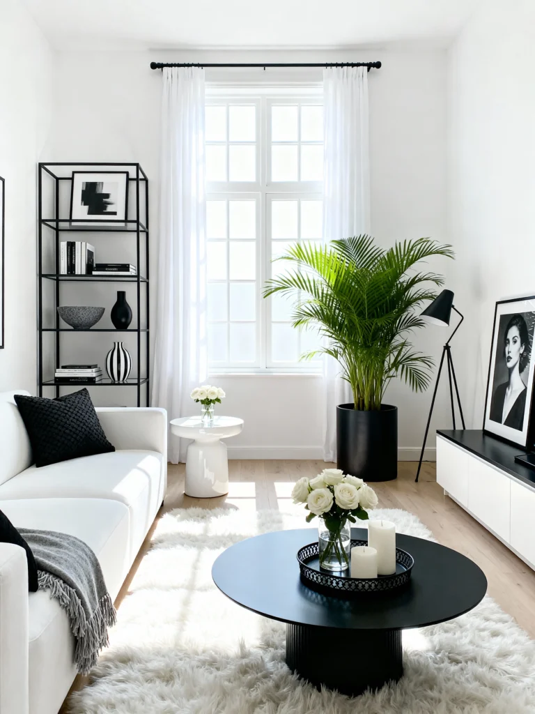 Contrast Corner Opt for a stark black-and-white color palette to achieve a modern, gallery-like feel. Place a tall, matte black planter with a large palm tree near the window to add height and greenery. Use a sleek, black metal shelving unit to display art books and monochromatic decor. Choose a pure white sofa to keep the room feeling bright and airy. Center a round black coffee table on a fluffy white rug to play with texture while maintaining the strict color scheme.