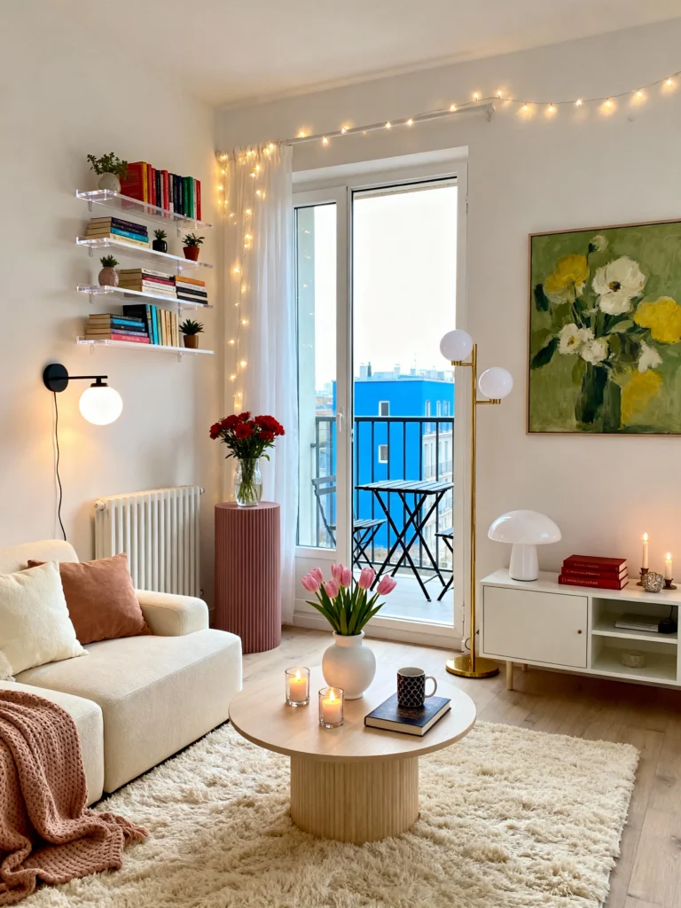 Soft Light Mount clear acrylic floating shelves to let your colorful book spines act as wall art. Place a ribbed, dusty pink pedestal table near the balcony door for a sculptural statement. Choose a floor lamp with multiple globe bulbs to cast a diffused, flattering light. Layer a chunky knit throw over a cream sofa for added warmth. Opt for fresh pink tulips in a round white vase to tie the romantic, feminine color story together perfectly.