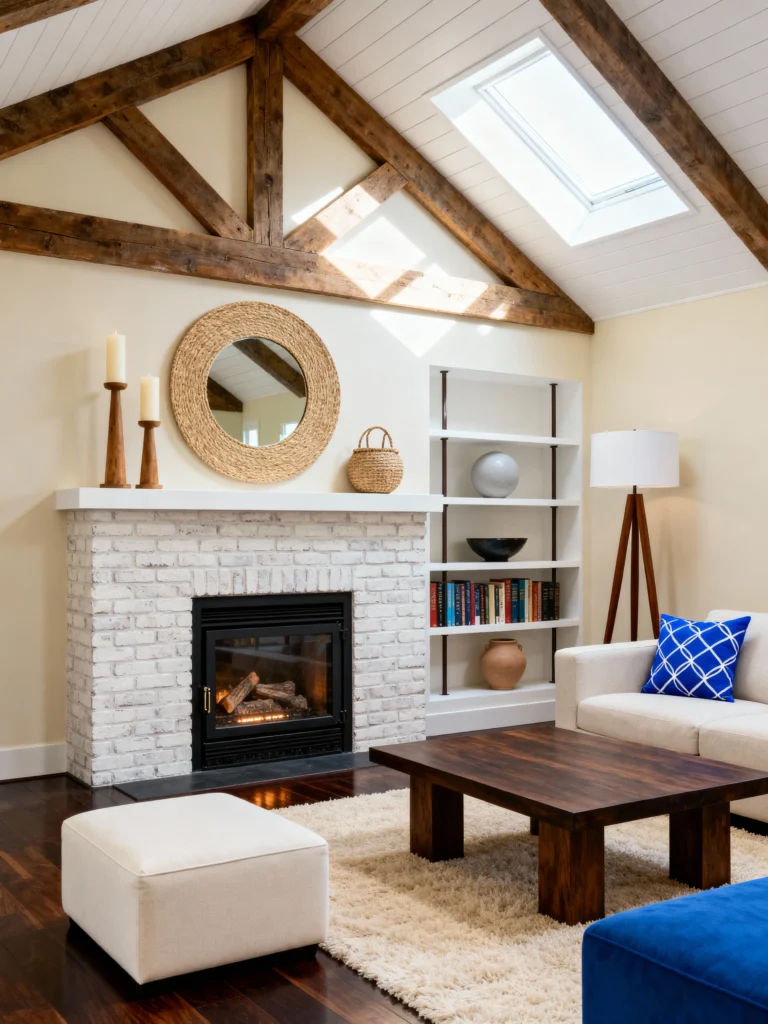Modern Farmhouse Anchor the room with a white-washed brick fireplace to create a bright focal point. Hang a round mirror with a thick jute frame above the mantel to echo natural textures. Choose a solid wood coffee table with chunky legs to ground the space. Paint the walls a soft cream to contrast with dark hardwood floors and exposed ceiling beams. Add a pop of electric blue with a patterned throw pillow or ottoman to break up the neutral palette.