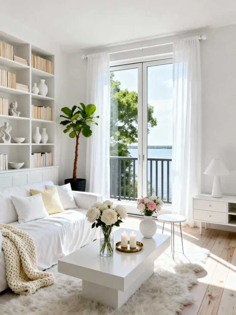 Coastal Pure Paint the walls and shelving a crisp white to reflect the natural light from the lake view. Position a white linen sofa facing the french doors to maximize the scenery. Fill a textured white vase with large white roses or peonies for subtle elegance. Keep the shelving styled simply with neutral tones—think turned-around books and white ceramics. Use a chunky knit blanket to add texture without disrupting the serene, monochromatic white-on-white palette.