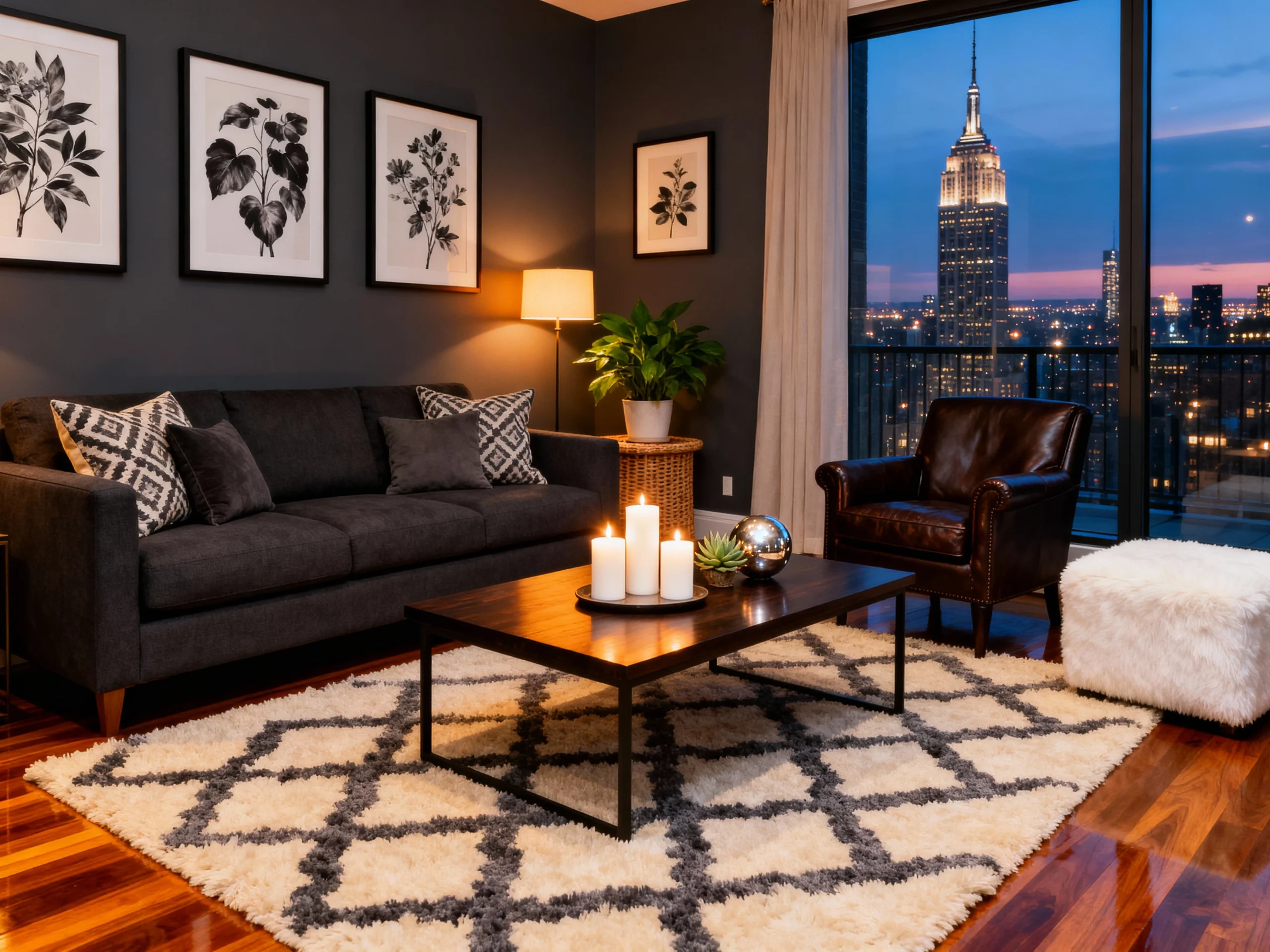 Skyline View Let the floor-to-ceiling windows do the talking by keeping window treatments minimal. Choose a sleek, charcoal grey mid-century sofa that complements the cool tones of the evening sky. Place a geometric, trellis-patterned rug to define the lounge area. Add a leather accent chair for a touch of masculine sophistication. Group pillar candles on a low, wooden coffee table to create a warm, flickering contrast against the blue city lights outside.