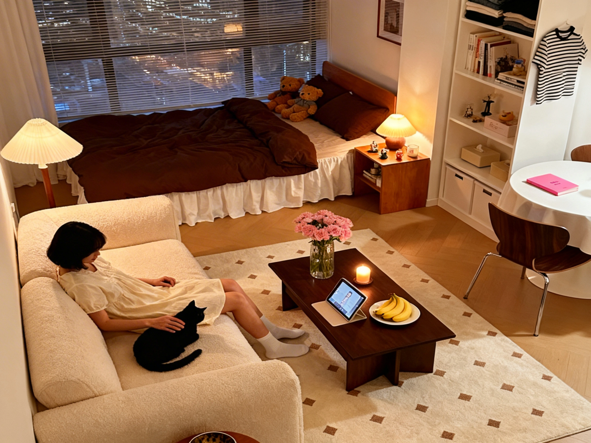 Set up the ultimate cozy night in against a backdrop of sparkling city lights. Pull a textured, cream boucle sofa into the center of the room for prime lounging. Set up a low, dark wood coffee table—perfect for your tablet, a glowing candle, and some late-night snacks. Keep your sleeping area tucked away with rich, chocolate brown bedding for a warm, grounded feel. Scatter a few small, pleated lamps around the room to cast a warm, ambient glow that perfectly complements the nighttime skyline.