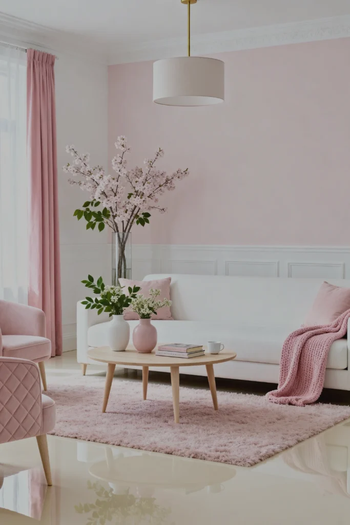 Paint the walls a soft, pastel pink to create a calming, feminine envelope. Hang matching floor-length pink curtains to visually heighten the room. Select a minimalist white sofa and drape a chunky pink knit throw over the arm for added texture. Place tall cherry blossom branches in a clear vase to bring height and a touch of nature indoors. Keep the furniture legs in light wood tones to maintain the airy, delicate atmosphere.