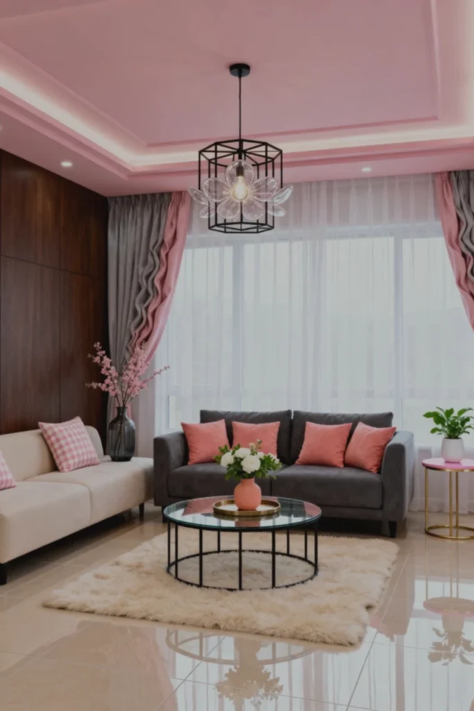 Install a unique, geometric cage pendant light to draw the eye upward immediately. Mix textures by pairing a dark grey velvet sofa with a light beige loveseat for contrast. Use pink accent pillows and draped curtains to soften the darker wood paneling on the feature wall. Place a glass-topped coffee table with a black metal frame in the center to keep the space feeling open. Add a fluffy white rug to tie the contrasting furniture pieces together.